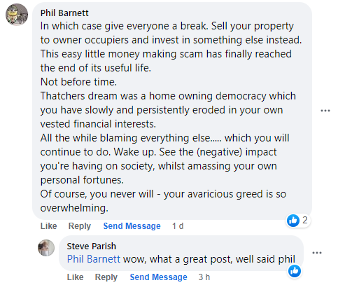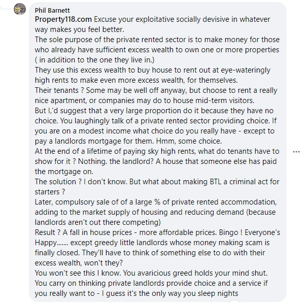 But on responding to these kind of posts you are probably wasting your time. Whilst the majority of people in UK are in the centre of the political spectrum there is a proportion of people who are rabid anti-capitalists. They don’t think people should be landlords, they don’t think people should own their own homes and they think government (run by people like them) should run everything. You are wasting your time trying to persuade these people to change their view and by responding rather than ignoring them you are just giving them free publicity.