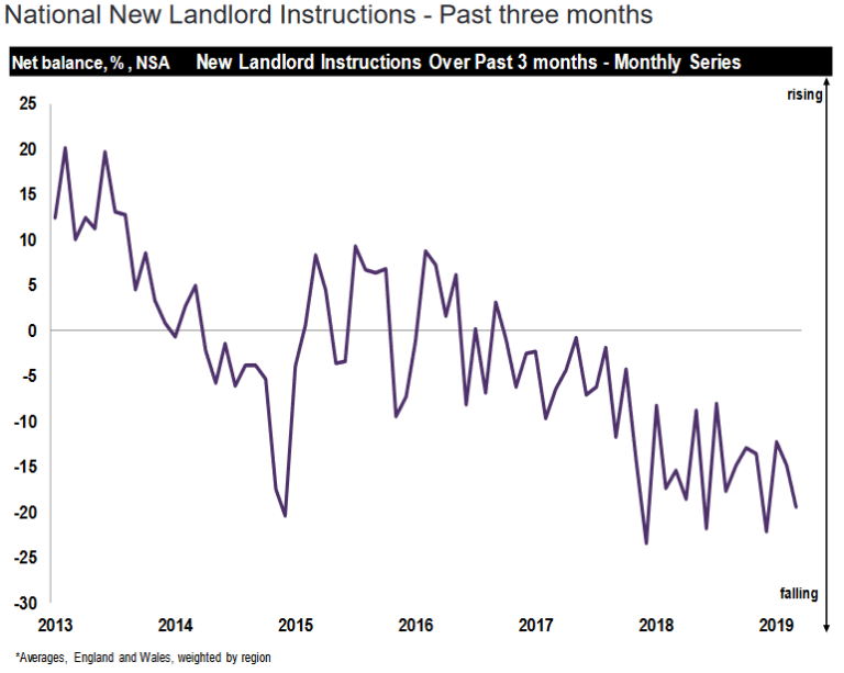 The ongoing decline in new instructions and new property coming on to the market continues, having become progressively weaker in each of the past four surveys, falling from the net balance of -20% in December, to -30% in March.