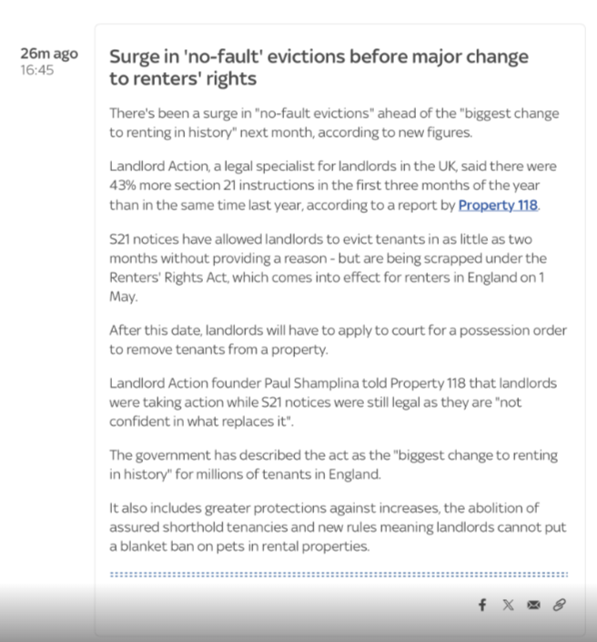 Did you see the recent Sky News coverage that linked to Property118? It was about landlords rushing to serve Section 21 notices before the 1 May changes.